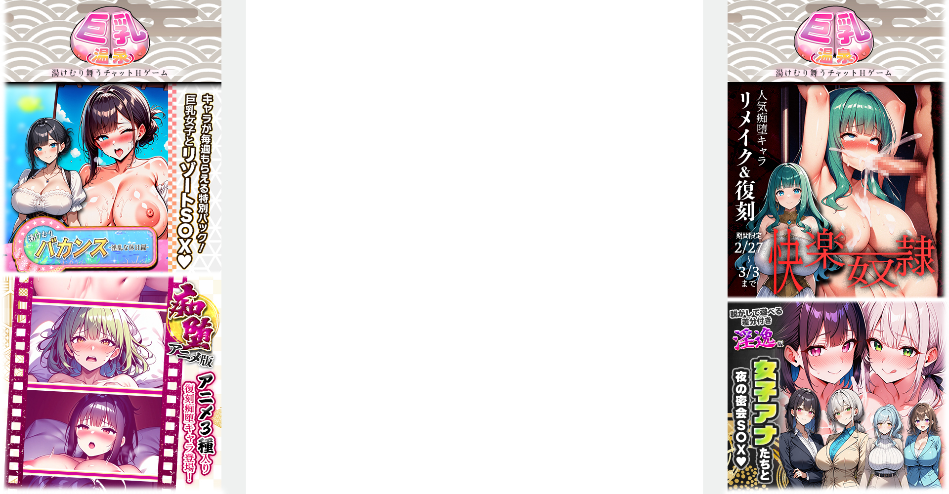 DLsiteにじGAMEを利用するにはブラウザのJavascript、および、CookieをONにしてください。 ピックアップ ゲーム一覧へ カワイイ女の子たちとダンジョン攻略! 今日も元気に摩訶不思議アクメンチャー♪ アライアンスセージ 今すぐ始める! 登録なしですぐに遊べる! ゲーム一覧へ もふちゃ!~もふもふチャット~ もふもふたちと、いちゃいちゃしよう ももメモ~ももいろメモリーズ~ かわいい女の子と24時間即レスチャット♡ マルチバースラブ かわいい女の子とラブラブHな毎日を過ごそう! パコホ~パコっとしホーダイ~ パコっと代を気にせずどこでもパコっとしホーダイ めるぺろ~メールでぺろぺろ~ あなたの言葉で彼女との運命が変わるHな恋愛シミュレーション! 新着ゲーム ゲーム一覧へ 性感コネクト~囚われの星乙女たち~ 壊れた少女を集めて蘇らせる、美少女放置RPG 淫獄の交歓ぷりんせす エロっ娘たちと時空を超えてハメはずし どM娘~淫乱美女を孕ませ快楽堕ち♡~ ご主人様待ちの「どM娘」たちがあなたの刺激を求めている! もふちゃ!~もふもふチャット~ もふもふたちと、いちゃいちゃしよう おっぱいラボ学園のお姫サマ戦略 秘密のラボでめくるめくお姫さまハーレム! ももメモ~ももいろメモリーズ~ かわいい女の子と24時間即レスチャット♡ 事前登録中ゲーム ゲーム一覧へ ぬぷぬぷっ!夜伽話 これは、世界を救う終わりなきおとぎ話。 人気ランキング ランキング一覧へ めるぺろ~メールでぺろぺろ~ 巨乳温泉~湯屋の桃源郷~ どM娘~淫乱美女を孕ませ快楽堕ち♡~ 4 英雄クロニクル 5 シュガーコンフリクトX -眠るセカイと神々の喰園- 6 アライアンスセージ 7 パコホ~パコっとしホーダイ~ 8 性感コネクト~囚われの星乙女たち~ 9 神楽大戦・陰之巻 10 空戦乙女-スカイヴァルキリーズX- 11 おっぱいラボ学園のお姫サマ戦略 12 ももメモ~ももいろメモリーズ~ 13 勇者なんてお断りX! ダウンロード対応アプリ アプリ一覧へ アライアンスセージ 摩訶不思議アクメンチャー♪ Android シュガーコンフリクトX for Android 家畜の私が、敵になった仲間を取り戻す物語 Android 開催中の企画・キャンペーン 【アテナの深掘り!】個人サークル「花うさキャット」デビューしたての涼花みなせさんに色々聞いてみました 【GIFあり】かわいい女の子を自分だけのものに…!!支配・洗脳系スマホゲーム3選!!【特集】 【トークキャンペーン】オススメの「心が温まる作品」を語って1000ポイント!? DLsite Play 通信 vol.4 偽善、裏切り、嘘、加害。甘い言葉の裏の顔。どろどろビターな背徳感 『アモラルアイランド』配信特別記念!あるぷ先生直撃インタビュー! 【GIFあり】ギャル題材エロゲ3選!ギャルとエッチって憧れるよね…【特集】 【GIFあり】女の子捕まえて弱いとこ執拗に攻撃💕触手スマホゲー3選!!【特集】 【2026年1月】月間ランキング! ※R18 【全年齢向け】売れ筋への感度の高いユーザーたちが買った作品まとめ【2026年1月版】 誰がなんと言おうと、俺はココ。一点突破のフェティシズム! 【GIFあり】おにいちゃん大好き…!!兄ラブ作品特集! 【成人向け】エロスへの感度の高いユーザーたちが買った作品まとめ【2026年1月版】 【ブルアカ特集】 DLsiteで話題沸騰中のブルアカ作品をピックアップ!【同人】【2025冬】 新成人にオススメ!純愛作品5選 【2026年1月】DLチャンネル運営が勝手に選ぶ、先月面白かったまとめ記事 【2026年1月】月間ランキング! 【GIFあり】夏休み作品特集!冬の寒さに「夏」で立ち向かえ!【特集】 【年間】2025年ランキング!【男性成人向け同人】