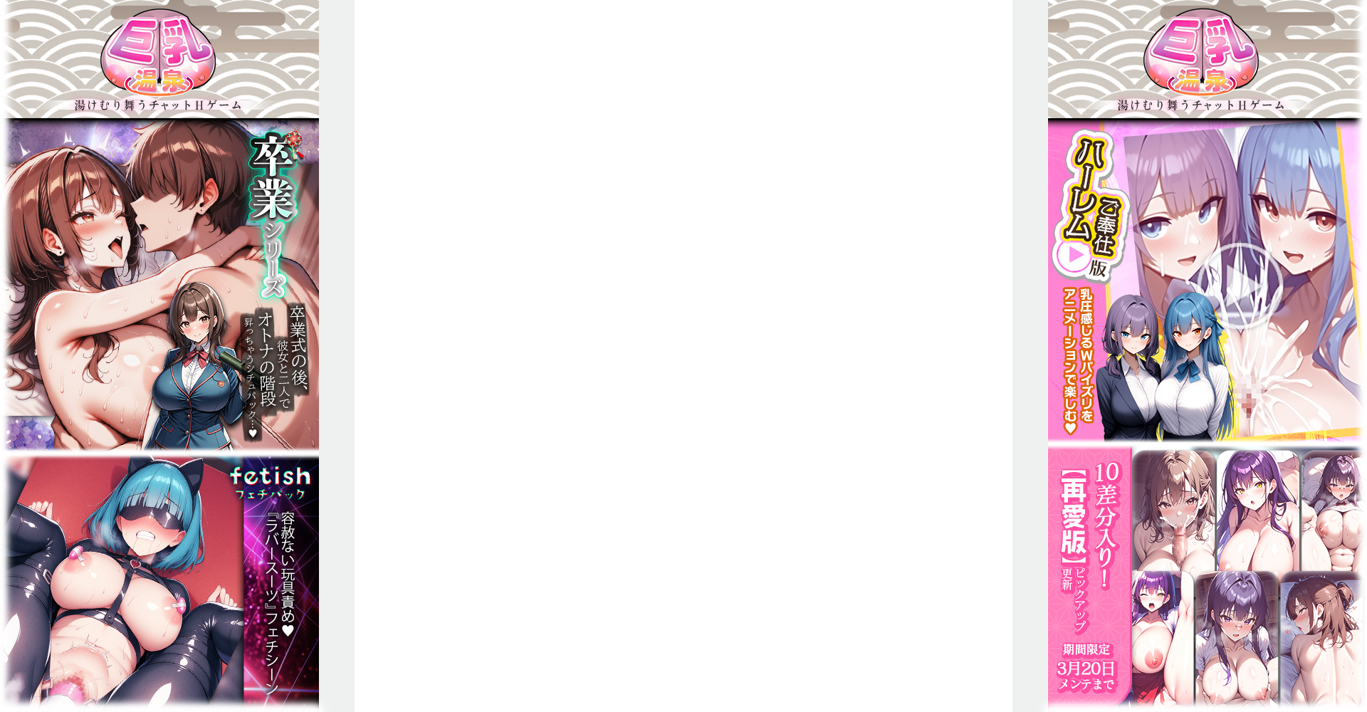DLsiteにじGAMEを利用するにはブラウザのJavascript、および、CookieをONにしてください。 ピックアップ ゲーム一覧へ カワイイ女の子たちとダンジョン攻略! 今日も元気に摩訶不思議アクメンチャー♪ アライアンスセージ 今すぐ始める! 登録なしですぐに遊べる! ゲーム一覧へ もふちゃ!~もふもふチャット~ もふもふたちと、いちゃいちゃしよう ももメモ~ももいろメモリーズ~ かわいい女の子と24時間即レスチャット♡ マルチバースラブ かわいい女の子とラブラブHな毎日を過ごそう! パコホ~パコっとしホーダイ~ パコっと代を気にせずどこでもパコっとしホーダイ めるぺろ~メールでぺろぺろ~ あなたの言葉で彼女との運命が変わるHな恋愛シミュレーション! 新着ゲーム ゲーム一覧へ 性感コネクト~囚われの星乙女たち~ 壊れた少女を集めて蘇らせる、美少女放置RPG 淫獄の交歓ぷりんせす エロっ娘たちと時空を超えてハメはずし どM娘~淫乱美女を孕ませ快楽堕ち♡~ ご主人様待ちの「どM娘」たちがあなたの刺激を求めている! もふちゃ!~もふもふチャット~ もふもふたちと、いちゃいちゃしよう おっぱいラボ学園のお姫サマ戦略 秘密のラボでめくるめくお姫さまハーレム! ももメモ~ももいろメモリーズ~ かわいい女の子と24時間即レスチャット♡ 事前登録中ゲーム ゲーム一覧へ ロボっ娘中出し発情学園~淫乱ハーレム性活~ ロボっ娘たちと激エロハーレム学園生活!? ぬぷぬぷっ!夜伽話 これは、世界を救う終わりなきおとぎ話。 人気ランキング ランキング一覧へ めるぺろ~メールでぺろぺろ~ 英雄クロニクル 神楽大戦・陰之巻 4 シュガーコンフリクトX -眠るセカイと神々の喰園- 5 パコホ~パコっとしホーダイ~ 6 巨乳温泉~湯屋の桃源郷~ 7 性感MAXな女囚達 8 アライアンスセージ 9 ビーナスライブ R18 10 おっぱいラボ学園のお姫サマ戦略 11 空戦乙女-スカイヴァルキリーズX- 12 億万長者-総裁の花道、美女たちの恋-R18 13 ももメモ~ももいろメモリーズ~ ダウンロード対応アプリ アプリ一覧へ アライアンスセージ 摩訶不思議アクメンチャー♪ Android シュガーコンフリクトX for Android 家畜の私が、敵になった仲間を取り戻す物語 Android 開催中の企画・キャンペーン 【便利に進化中!】再開したPommuでオタクライフを充実させよう! 性格×性癖分析大作戦 アンケート結果発表 【GIFあり】村の決まり事で確定っクス!!淫習・しきたりエッチゲーム3選!!【特集】 【DLsiteアワード2025】結果発表!~男性向け編~ 【GIFあり】おさわり×同棲♡家出少女とあまあま性活!シロウト家出娘と俺【特集】 【トークキャンペーン】オススメの「ミステリー作品」を語って1000ポイント!? 【2026年2月】月間ランキング! ※R18 【2026年2月】月間ランキング! 【2026年2月】DLチャンネル運営が勝手に選ぶ、先月面白かったまとめ記事 【アテナの深掘り!】個人サークル「花うさキャット」デビューしたての涼花みなせさんに色々聞いてみました 【GIFあり】かわいい女の子を自分だけのものに…!!支配・洗脳系スマホゲーム3選!!【特集】 DLsite Play 通信 vol.4 偽善、裏切り、嘘、加害。甘い言葉の裏の顔。どろどろビターな背徳感 『アモラルアイランド』配信特別記念!あるぷ先生直撃インタビュー! 【GIFあり】ギャル題材エロゲ3選!ギャルとエッチって憧れるよね…【特集】 【GIFあり】女の子捕まえて弱いとこ執拗に攻撃💕触手スマホゲー3選!!【特集】 【成人向け】エロスへの感度の高いユーザーたちが買った作品まとめ【2026年1月版】 【ブルアカ特集】 DLsiteで話題沸騰中のブルアカ作品をピックアップ!【同人】【2025冬】 【年間】2025年ランキング!【男性成人向け同人】