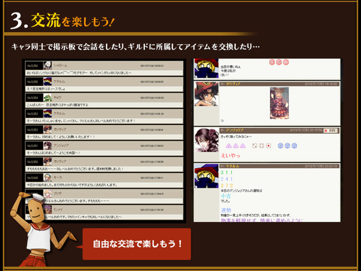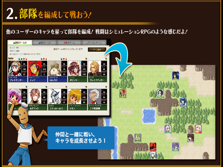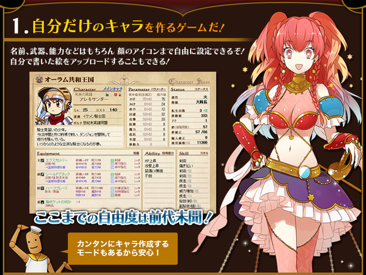 英雄クロニクルはキャラメイクに特化したシミュレーションRPGです。 プレイヤーは、5つの国が覇権を争うブリアティルトを舞台に、 歴史を創る英雄候補者として世界に解き放たれます。 本作は、かなり自由度の高いキャラメイクが可能で、選べる能力・スキルは200種以上、 キャラ説明やセリフは自由に編集する事ができ、さらに、容姿はイラストをアップロードして設定する事が可能です。 理想のキャラを創造して、英雄クロニクルの世界をお楽しみください。
