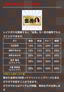 3回攻撃したらレイドボスの女の子が手に入る可能性がありますってルールに書いてあるけど、レイドボス情報に何%か書いてないからどれくらいの確率か分からない…