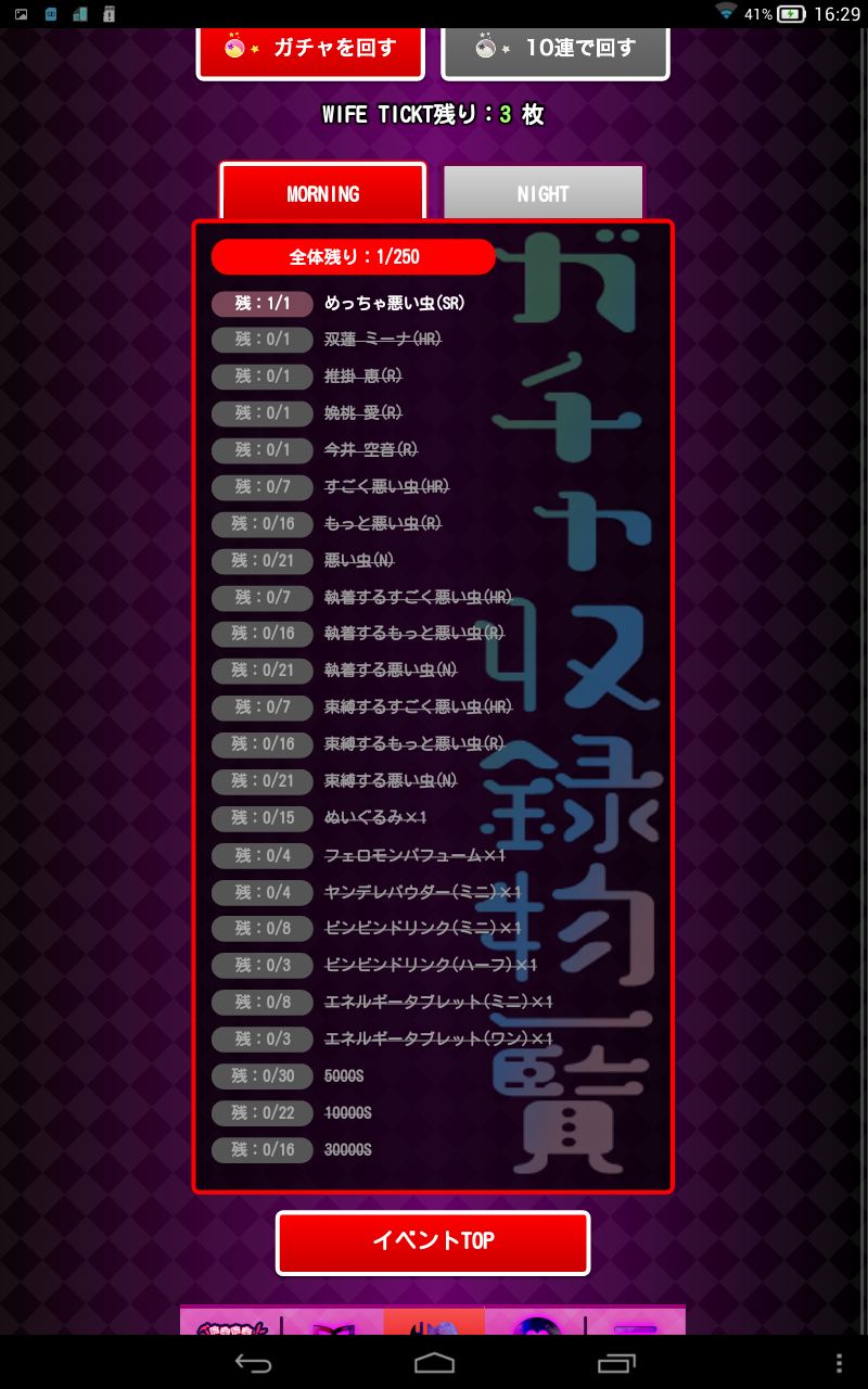 悪い虫がいっぱい探索行かなくていいくらい今回のガチャ悪い虫系ばかり出る。しかもあまり使い道ない執着と束縛ばかり。エネタブとかヤンデレパウダーとかの比率もっと増やしてほしい。