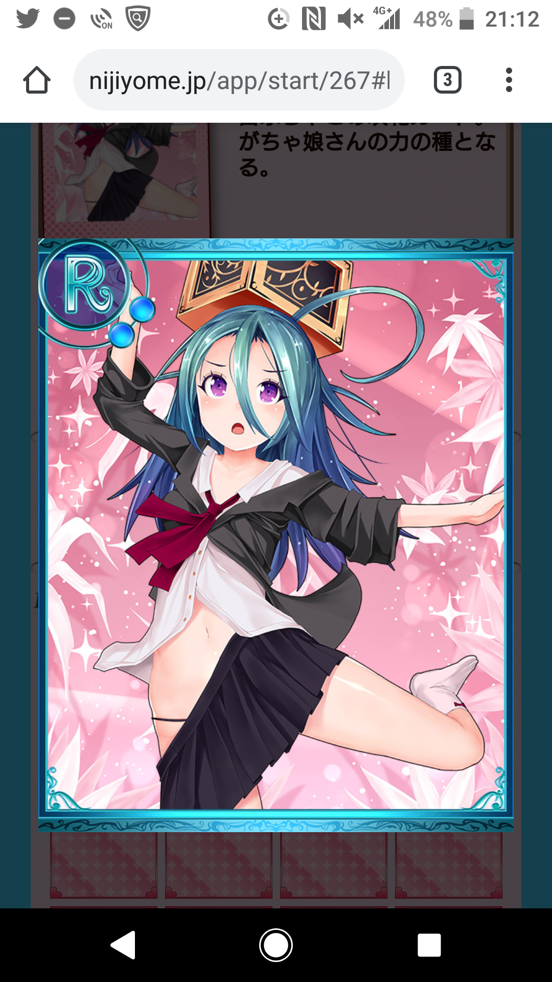 初期カードの錬金術部活(?)カードに合わせられたとんがり帽子もサイズ共々強調しすぎずしかしスチームパンク系への発展の可能性を備えた他のパーツのファッションと調和の取れた格好になって一番最初のカードデザインでありつつそのキャラの性格を代表するデザインになっているのが大変秀逸だと思う素晴らしいキャラデザインだと思うのです!