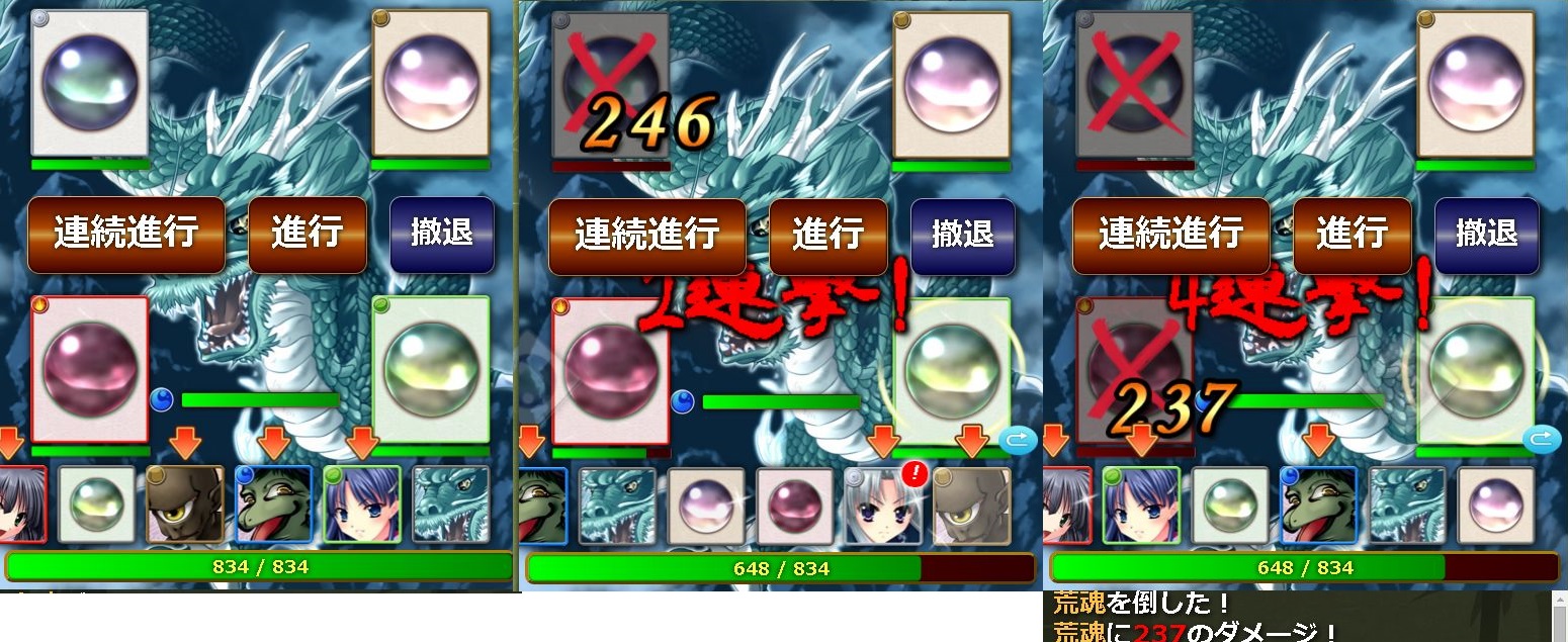 竜神戦の各魂の攻撃を進行で調べてみたけど、左上が復活持ちで右上と右下が回復持ち、左下は攻撃のみしかやってこないみたいだね
