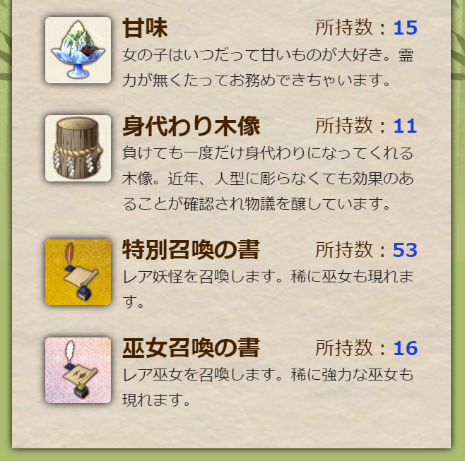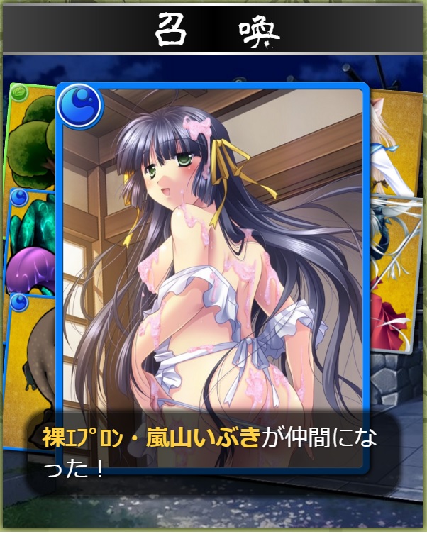 巫女召喚の書イベント入手分7枚+倉庫に残ってた3枚の計10枚引いたけどSRは道中記・いぶきと幻想譚・梓紗の2枚手に入った!(どちらも初入手)