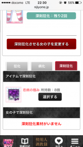 狂化するタイミングは病み日効果で狂化経験値2倍の日がたまにあるのでそこにヤンデレボーナスの狂化経験値1.2倍or1.5倍を付けるといいですよ -