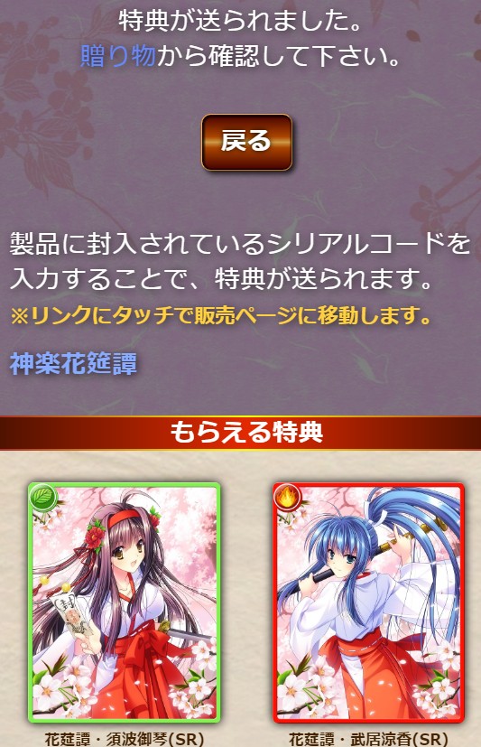 神楽花莚譚の特典が受け取れない件、改善されました。