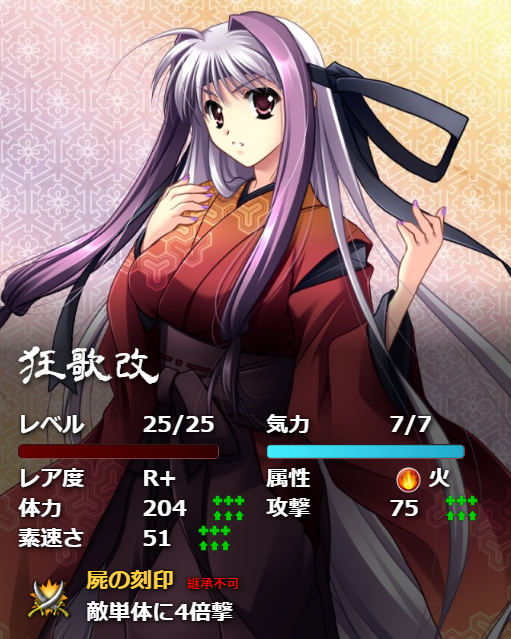 ただいま狂歌R初ゲット。強化不足の決死隊編成。