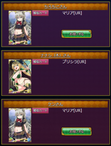 で、結局特効引けなかったので特効3枚ガチャ引いてみたのですが、確定1枚のSR以外のところでURが引かれることもあるんですね。こっちは普通に嬉しいですね。