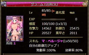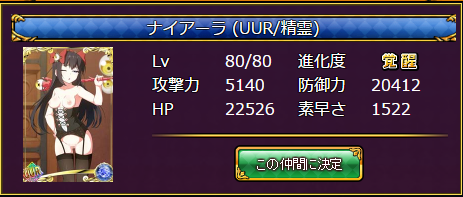 BOXガチャの新URナイアーラ、初のまともな防御URですね。LV80時のステはHP22526、防御20412。同じスキル(ラシュゲル)持ちのメディンキラがHP19067、防御18938。ダメージ計算式をまともに考察していないのでこの差がどれくらい実用的かがわからないT_T