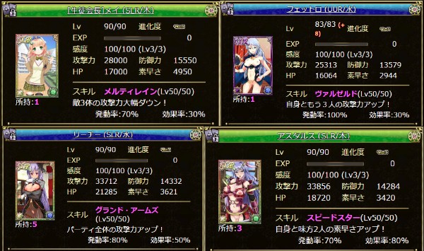 あとバランスとるため、やっぱ防御型は攻撃力は極低になるんですね。ちょっとレイド部隊とかには採用しづらいですね(それ以前に、そこまでバフ・スキルが揃いませんが)。