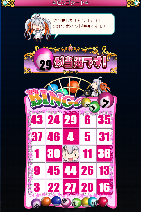 ・・・とはいっても、3連ビンゴとか、この速攻ビンゴとかはかなりレアなケース(多分、普通の人はイベ中1回あるか)だけど、道中SRの5000ptとほぼ同じptなんですね。