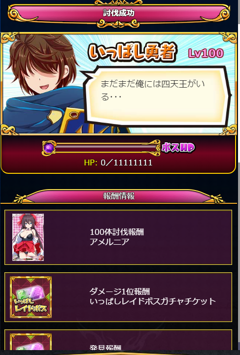 Lv50あたりとLv70あたりで強さがジャンプして、最後のLv100になると、よく見る【HP:11111111】の勇者になります。