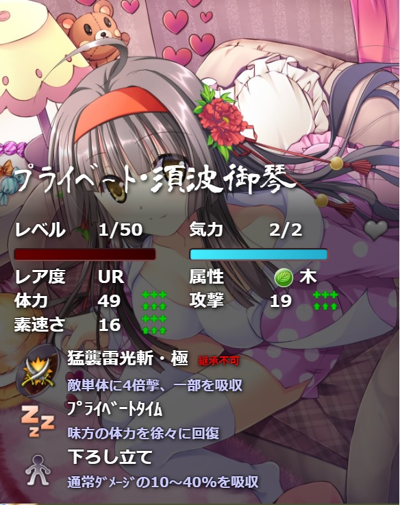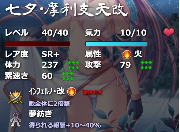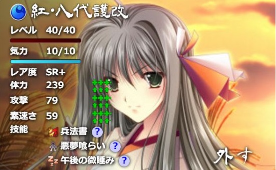 ②基本技能を低確率で習得するSR+の例:紅・八代護などのタイトル名付SR、回復技能持ちSR(メイド,裸エプロン等)、スクールライフ、ブライダル、鬼女等