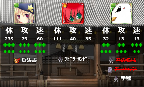 自分のやり方は、まずおちみず×2+欲しい技能持ち妖怪でおちみず改(忘却+○○)を制作し、SR巫女+SRでぼ雀+おちみず改で技能〇〇持ちSR巫女を制作します。これを、3体(それぞれ、別技能持ち巫女)制作します。