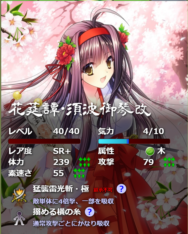 HP259、攻撃82、速度55 SR+囚われ・サミーラ改(乙女の介抱、鬼神力、再生) ※修正前