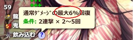 2連撃目(最初に効果を発揮するとき)が、下ろし立て10%、飲み込む6%ということですね。実際にやってみて確認取れました。つまり回復倍率は、