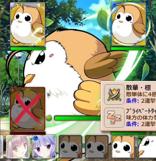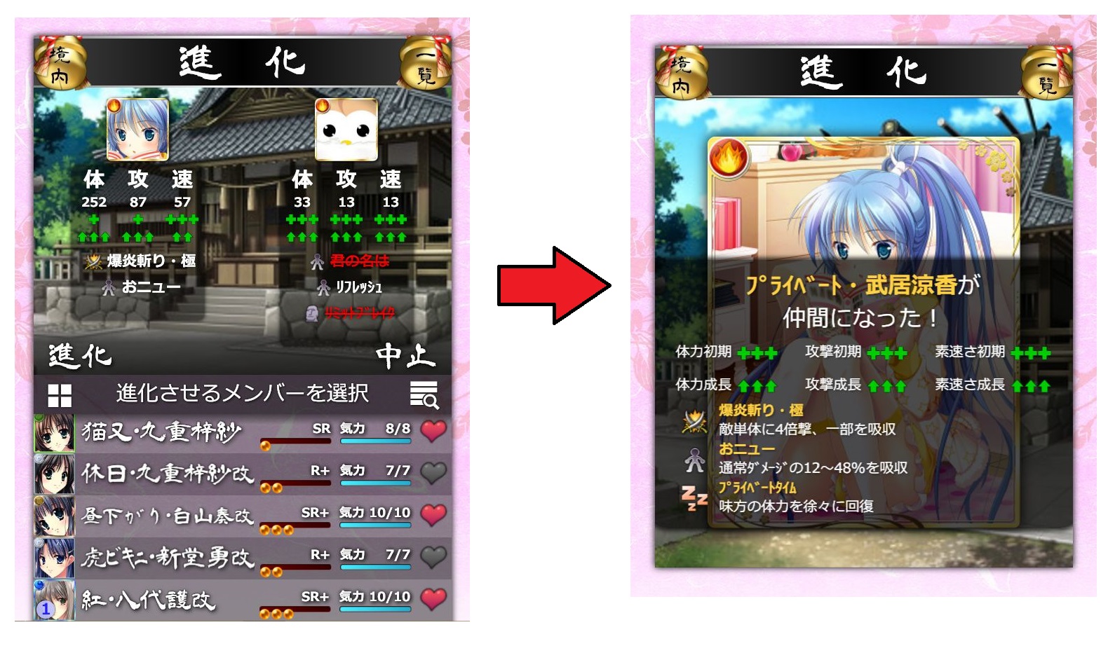 昼下がりシリーズ等、一部のキャラは進化時に攻撃技能改無し→改が100%確定しているので、攻撃技能を消去していてもSR+→SR+でも進化時に攻撃技能改として復活してしまいます(攻略スレ[527]付近)。