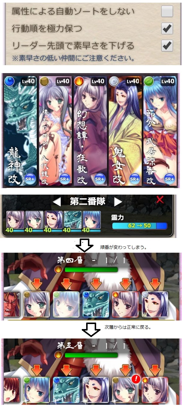 >239の設定(「リーダー先頭」チェック、「行動順を極力」チェック無し)だとリーダーでもない学園小春が龍神の前に出てきます(中央)