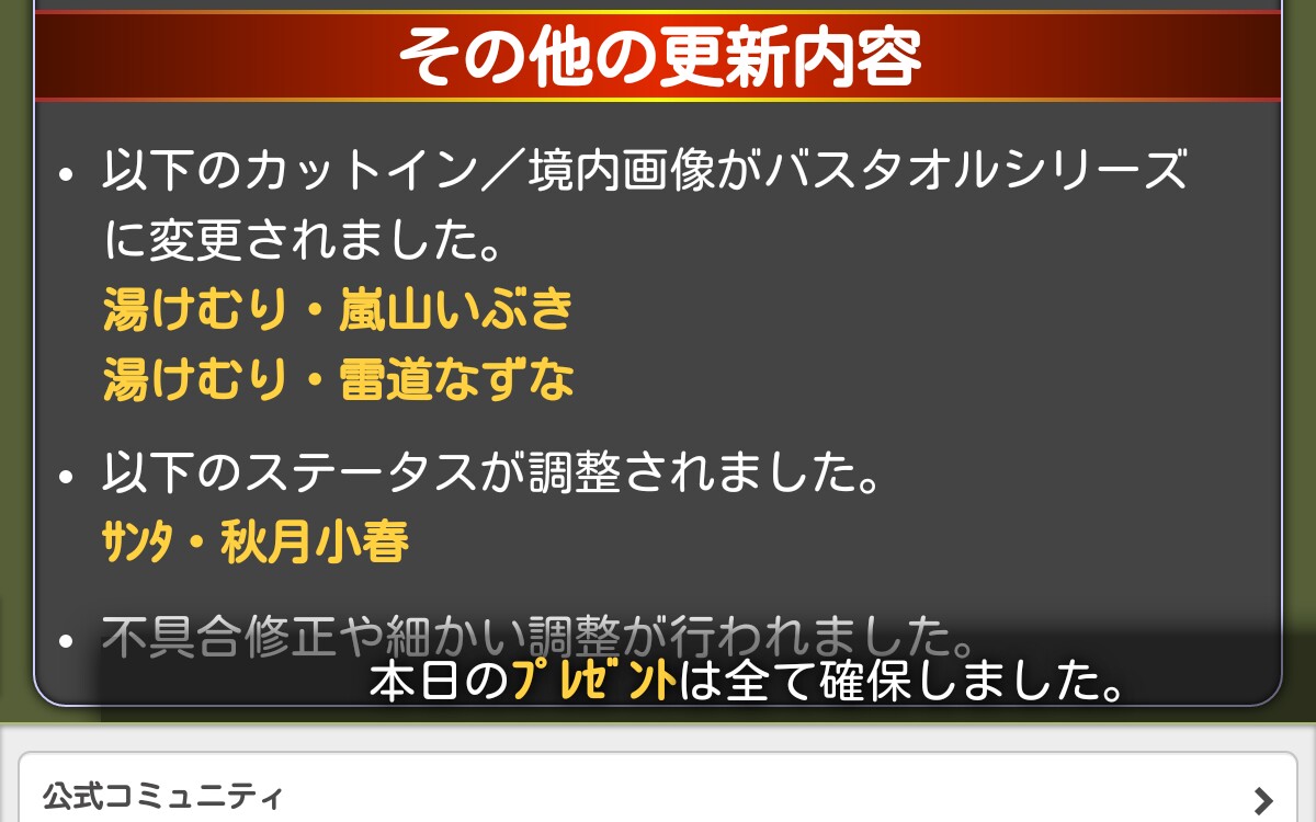 対象の巫女以外でプレゼントを受け取るといぶきのイベントが起こってしまう問題を修正しました。申し訳ありませんでした。