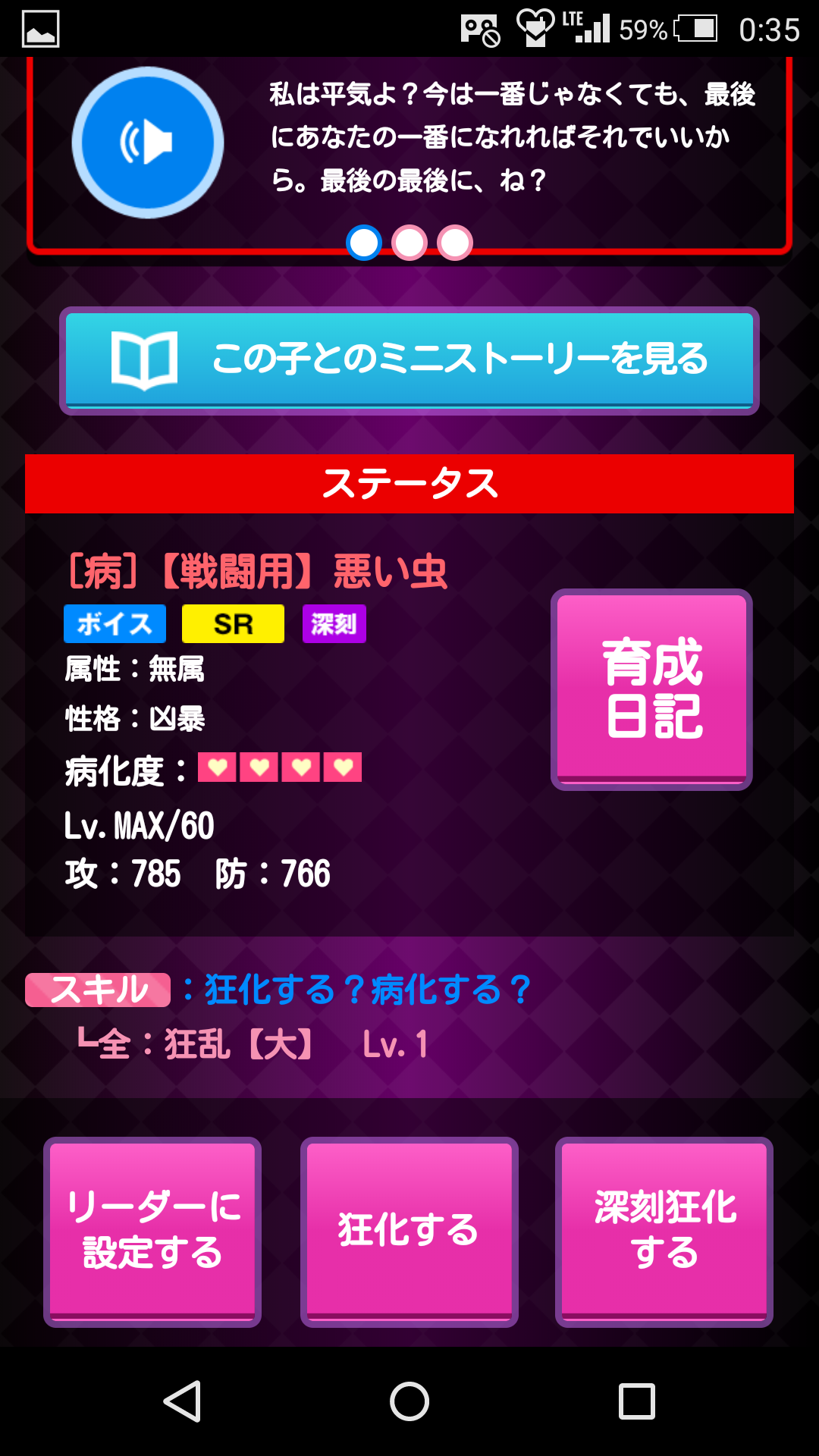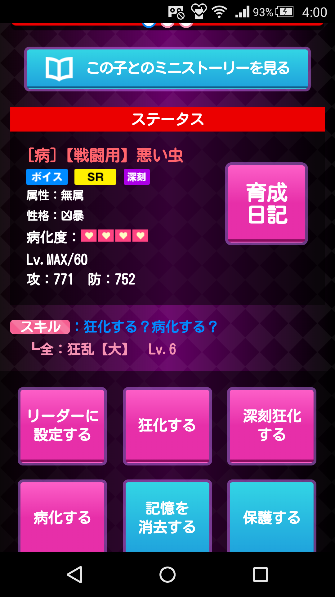 ⑥「育てたいキャラ++」をLv40まで育てた後、同一カードか恋病の極みで深刻病化を4回繰り返します