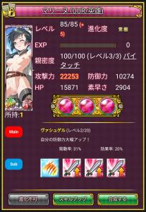 Lv85、攻撃のエロリア大×3、サブスキル装備です。マリーヌの為にサブスキル買いました(*・ω・)ノ ガシュタン持ちマリーヌです(笑)