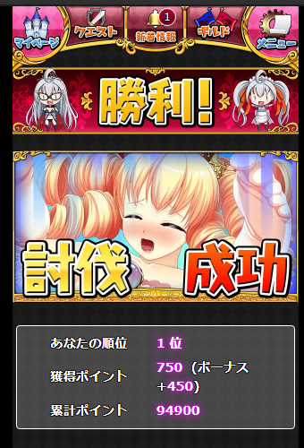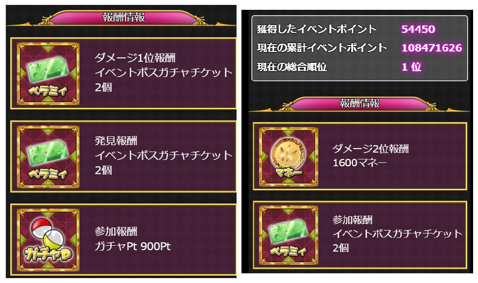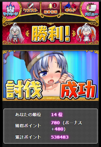 ちなみに、討伐時に得るイベpt報酬はダメージ順位関係なく、与えたダメージ量に比例した値になります。あと、トドメを刺した場合、余ったダメージはイベpt的にならないので勿体ないことになります。