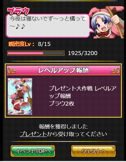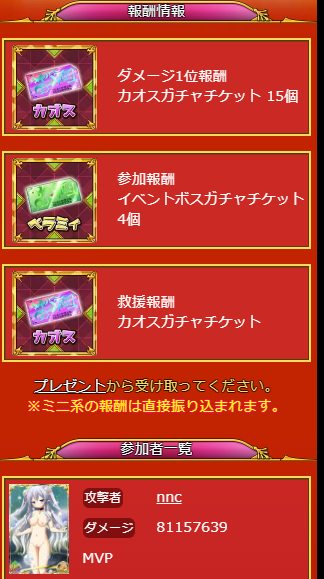 ということで、実はダメ順位報酬は1位より2位以下の方がいいかもという気が。ダメ6位とかでもポーション貰えることあります。