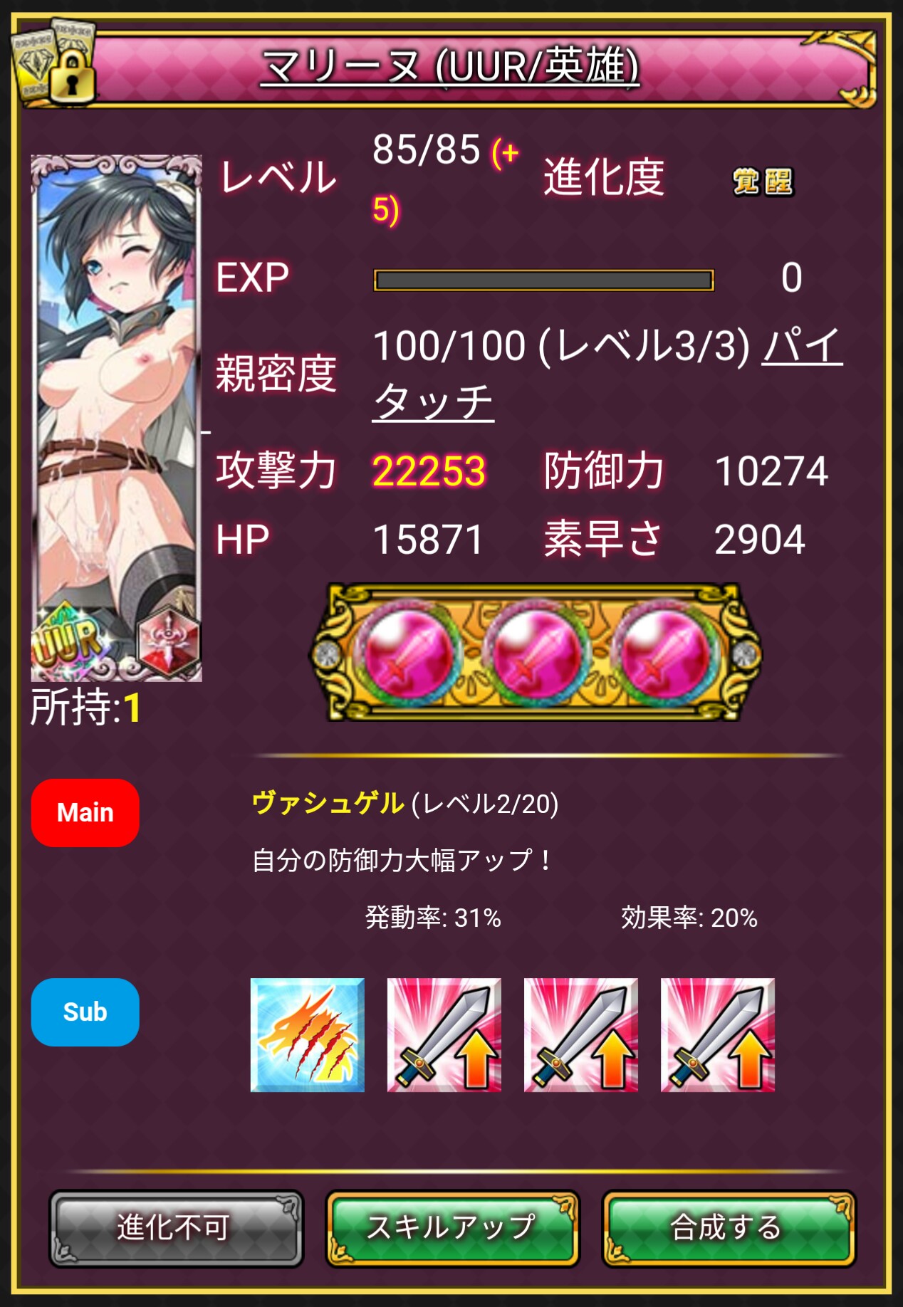 メインスキルは、スキルマ&エロリア強化でも耐久回数変わらない状況が多いっぽいので上げてません。