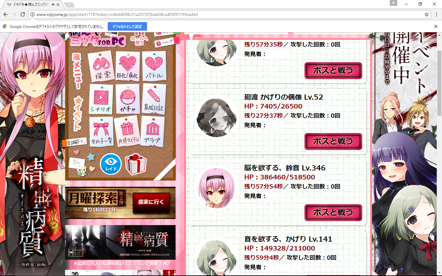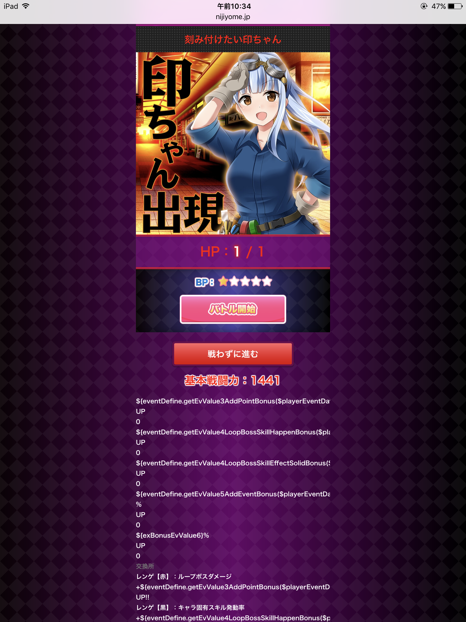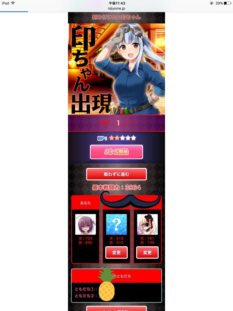 メンテナンス後から、ボスを攻撃するを選んでもエロやんが表示される404の画面に跳ばされる様になってしまいました。選ぶ度に飛ばされるので撃破出来ません。