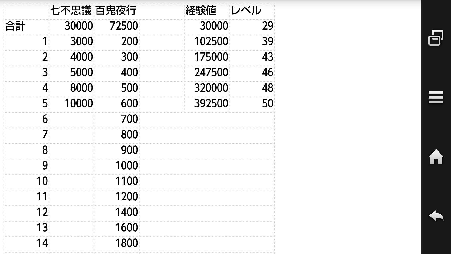 経験値とレベルの行だけ見ていただければよくて、経験値を392500(七不思議1回で30000、百鬼夜行5回で72500*5)稼ぐとレベル50になってる、という意味です(正確な50レベルに必要な経験値を求めたわけではない) -