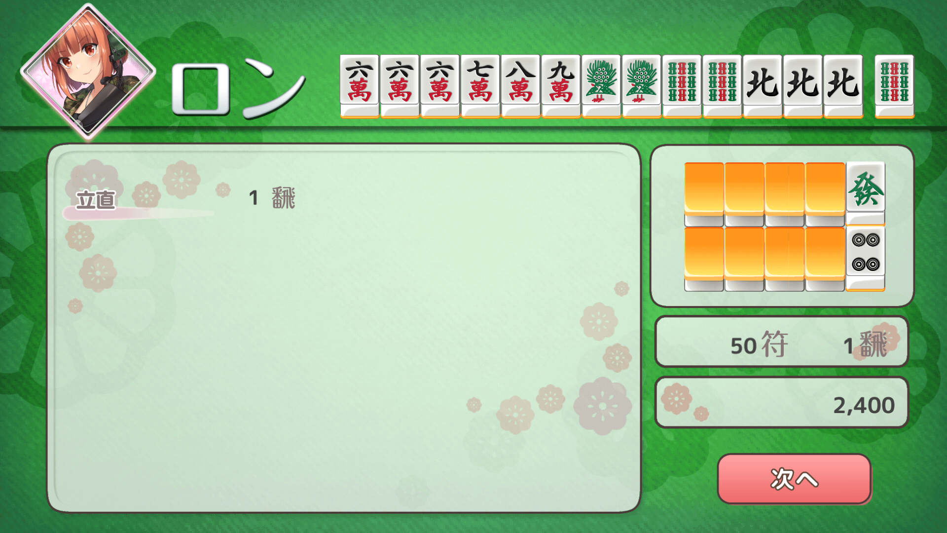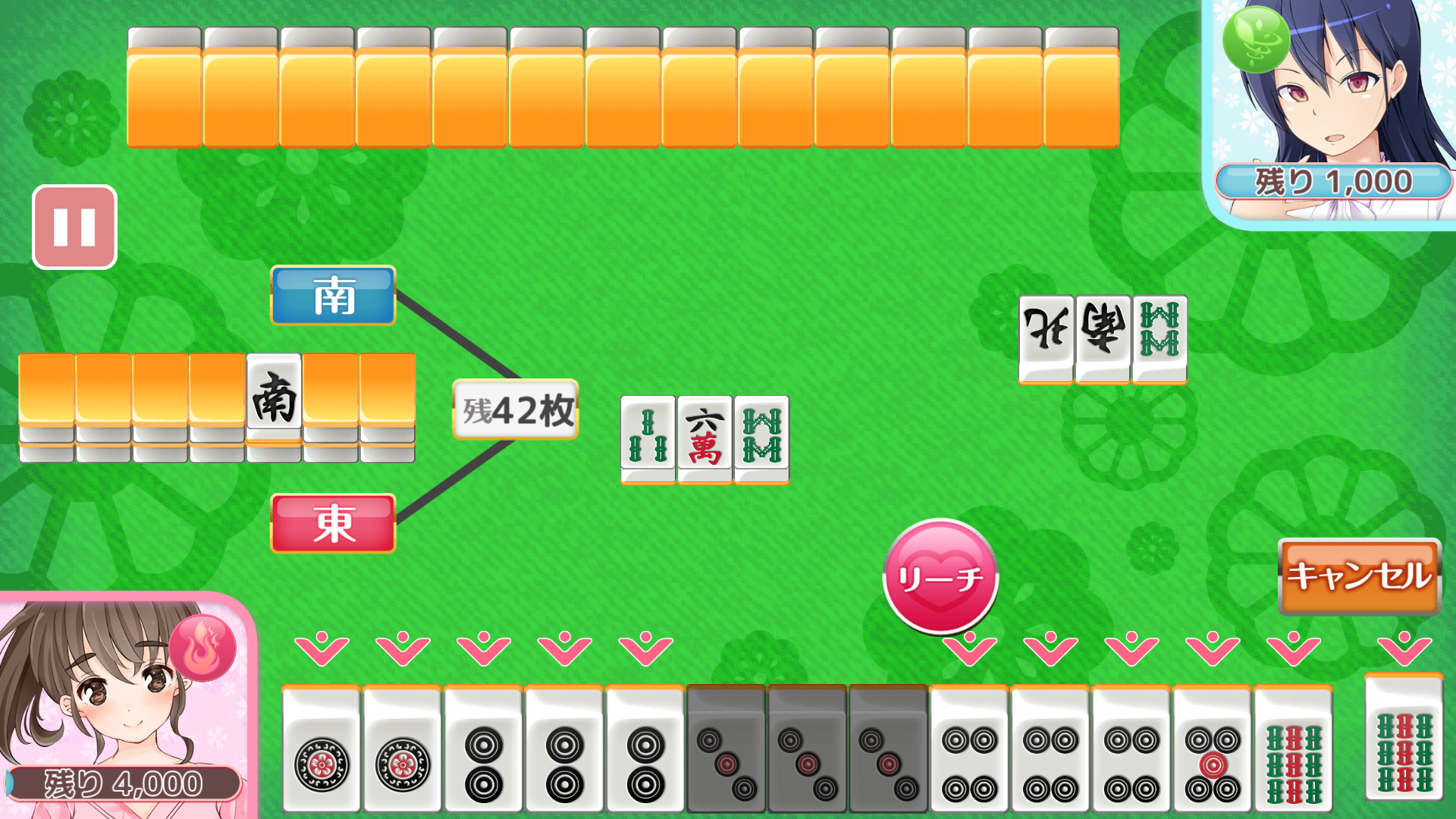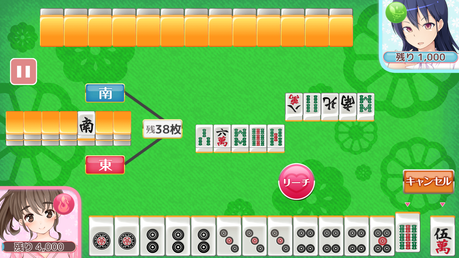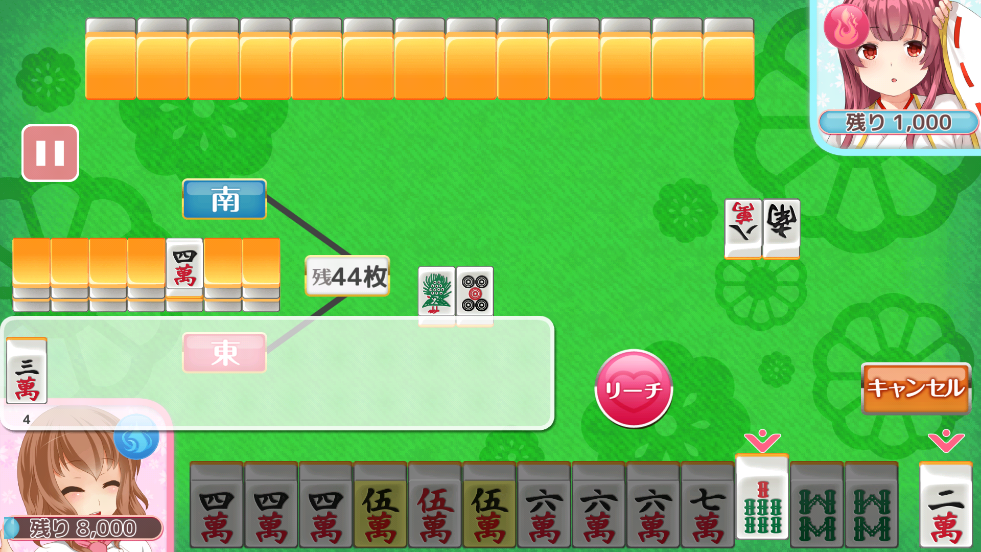 二人麻雀のこのシステムでは字牌4枚来たら即暗カンしてたので、確認出来てませんが、そういう4枚使いの「使い切り」リーチができそうですね(苦笑)