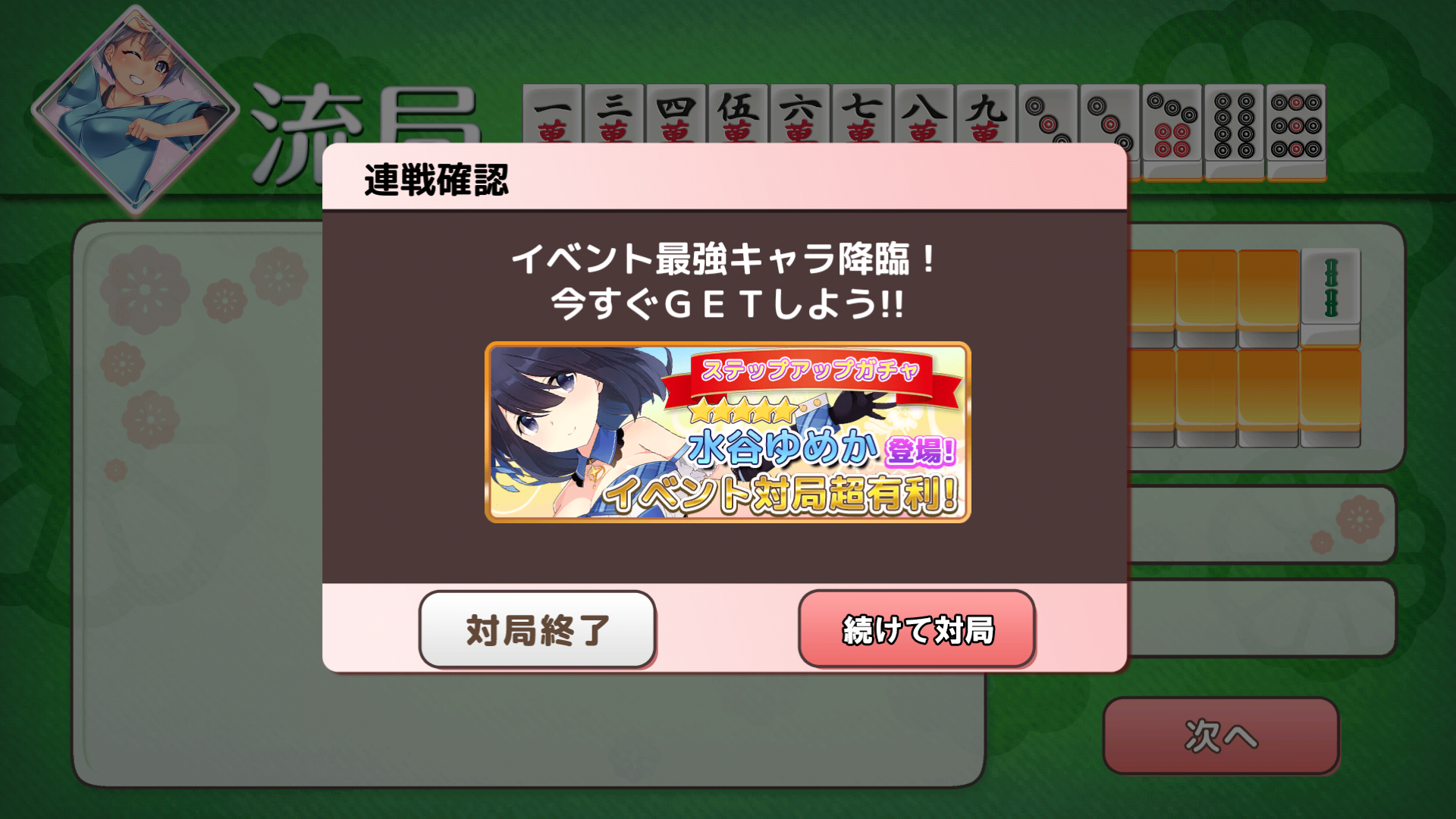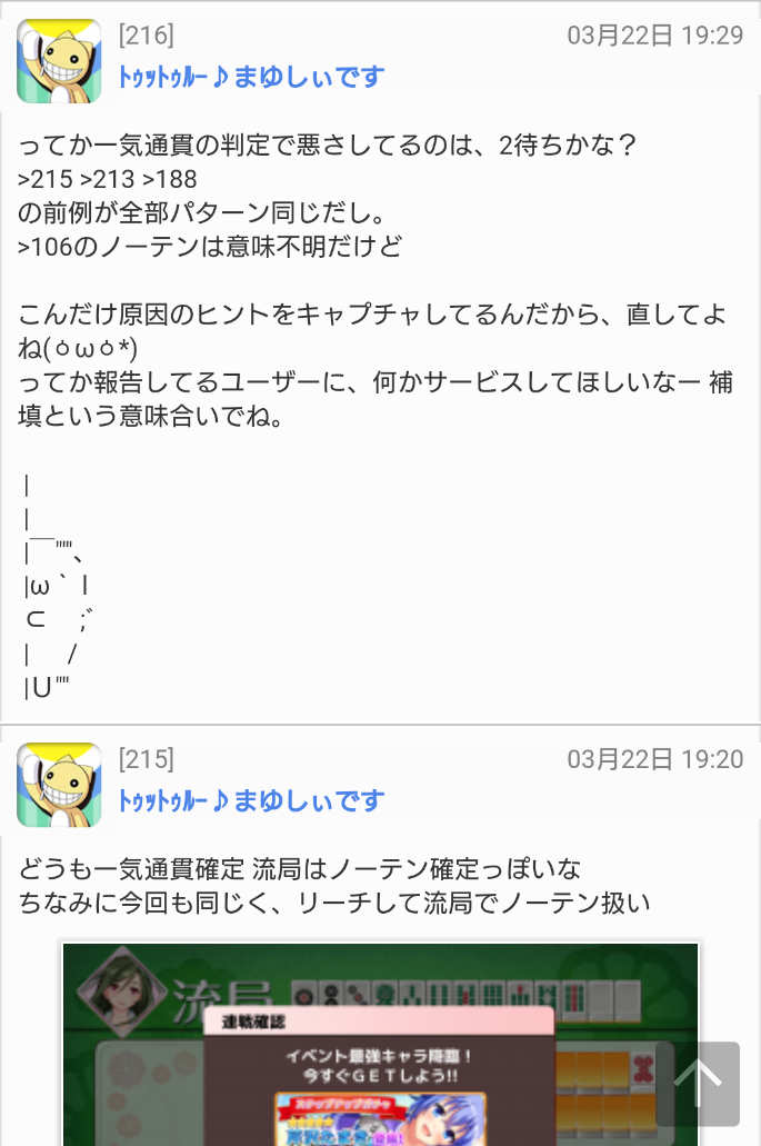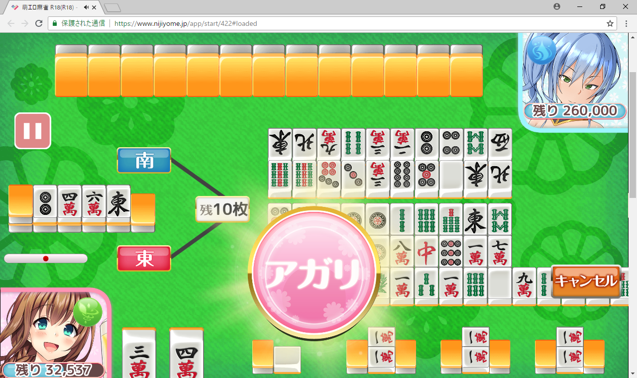あと、にじよめが悪いのですが、にじよめサーバが落ちると、にじよめ経由でログインしてる為、この萌えろ麻雀が出来ない問題もなんとかして欲しいですね。
