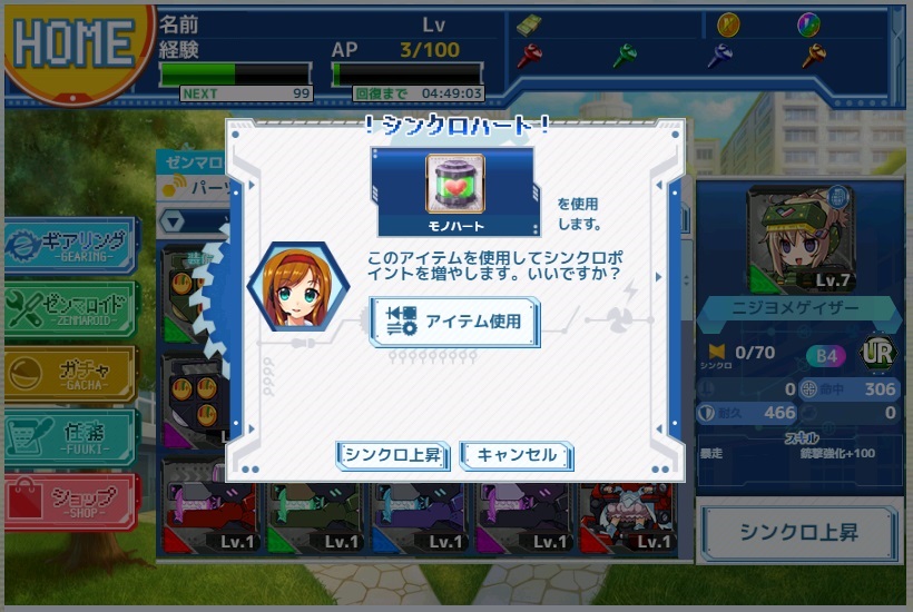 売却したパーツのレアリティごとに、例えばN売却なら1枚・R売却なら10枚付与したり、1日1回無料で回せるシステムは必要だと思います。 -