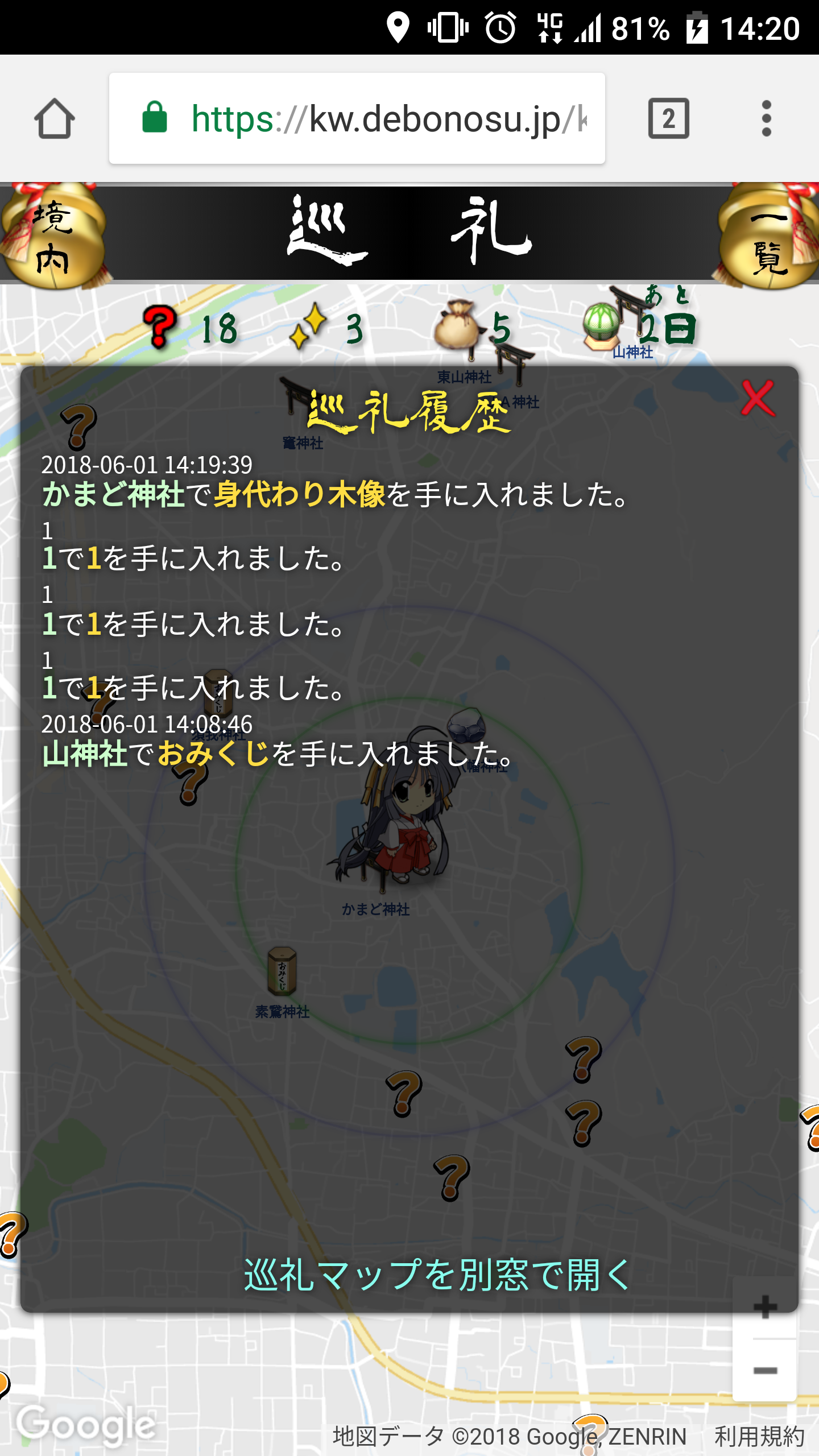 つまり巡礼マップ上で見ることの出来る神社は、巡礼プレイヤーが近くを通ってくれた証なのですね。
