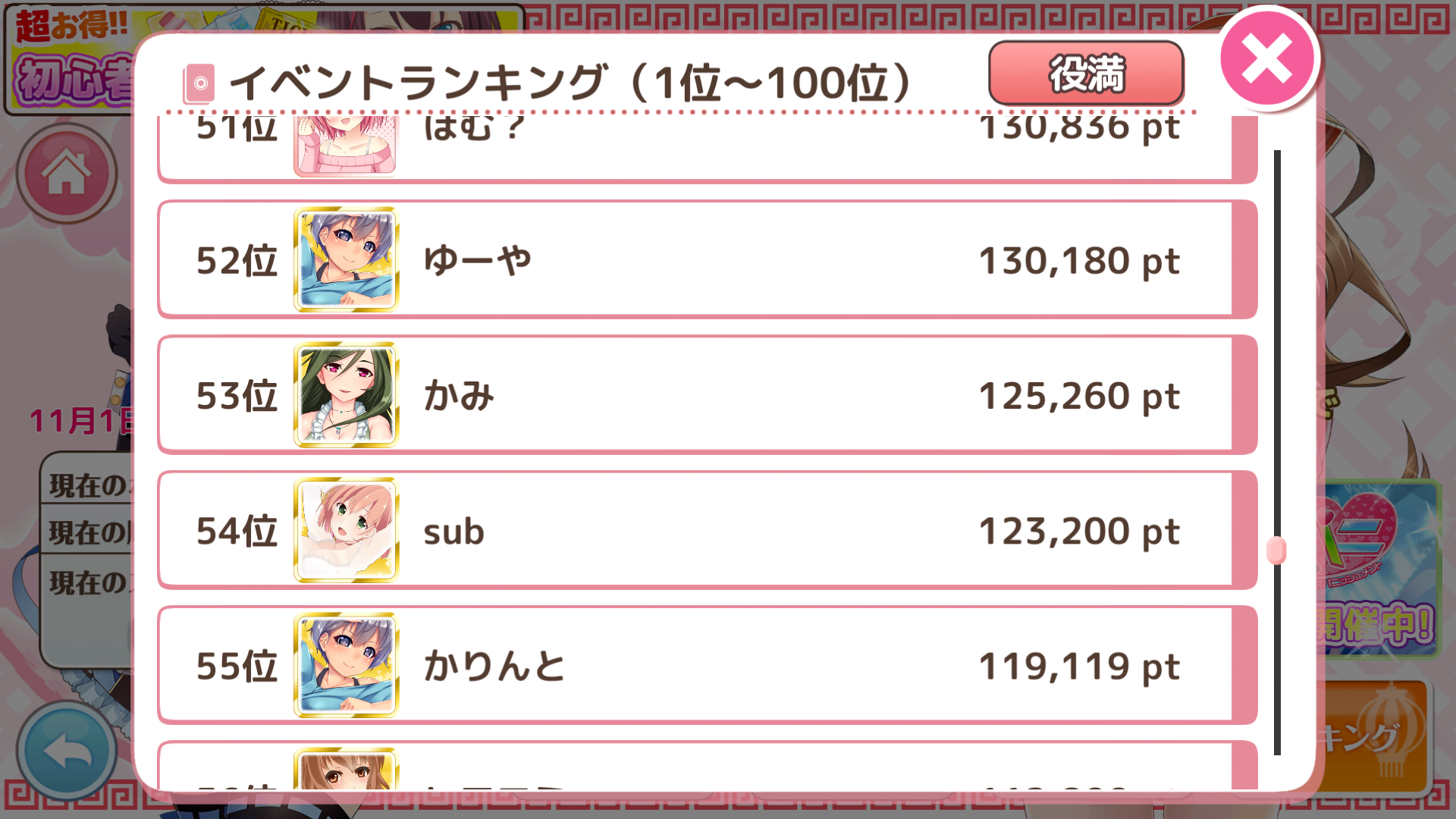 とりあえずレベル100まではなんとかいけました。が、順位は500位。とても200位以内に入れそうもないので諦め、とにかくガチャチケット集めや全国とかも回しながらレベルアップに努めます。 -
