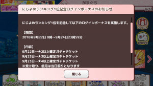 正直、赤羽ちかは、チュンリンよりステータス落ちるので(下位互換)、101位~の1体報酬で充分かなーと思ってたけど、気がついたら引き下がれない位置(50位圏内)にいたので、頑張ってしまいました(・x・)