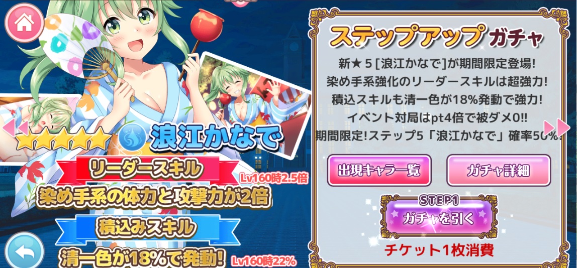 ログインボーナスで貴重な★5確定チケが2枚も入手できるのに、★5出現キャラが固定の娘ばかりなのでそこが残念な限りでした。