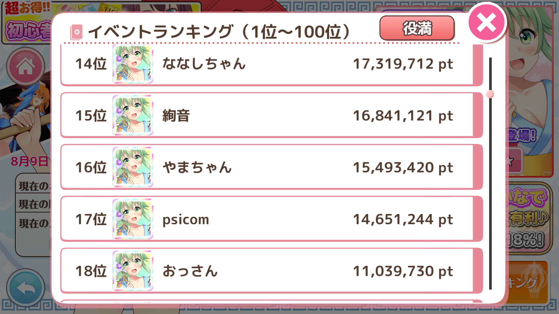 土曜日現在の特効キャラで人数は、ランキング確認出来る限り17人?