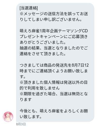 今回、再抽選を行っておりませんので当選されている場合はTwitterアカウントまでご連絡頂ければ送付が可能かもしれません。