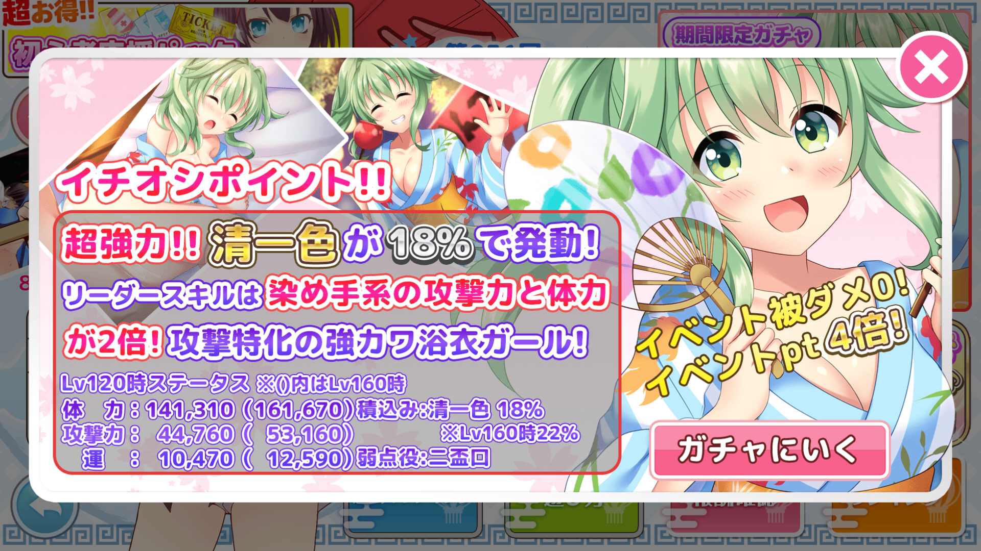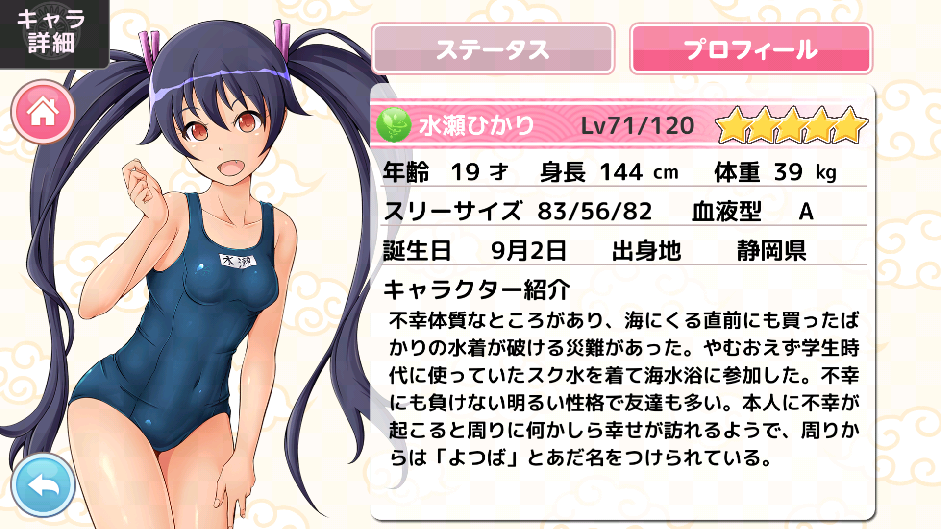 スク水とか競泳水着とかも好きなので、今イベは少し食指が動いたのですが、貧乳なので流すことにしました。広告にはCカップとあるのに、どう見てもB以下なので…。(ここでも、広告と実ステの乖離?(^^;))