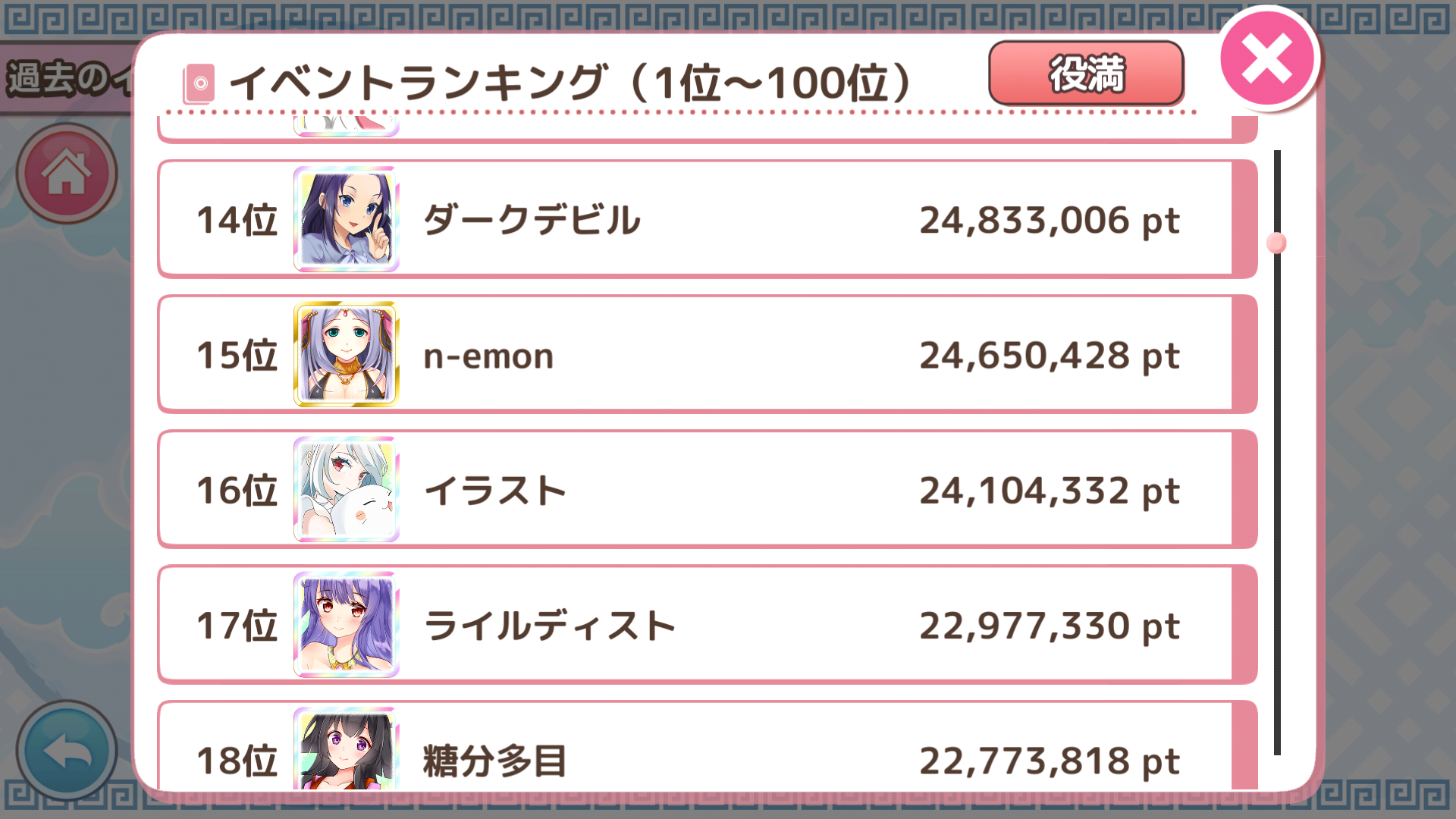 同じキャラに毎日投票していた人ばかりだと思うので、得票数13票とか26票とかいうキャラが沢山いることでしょう(^^;)。