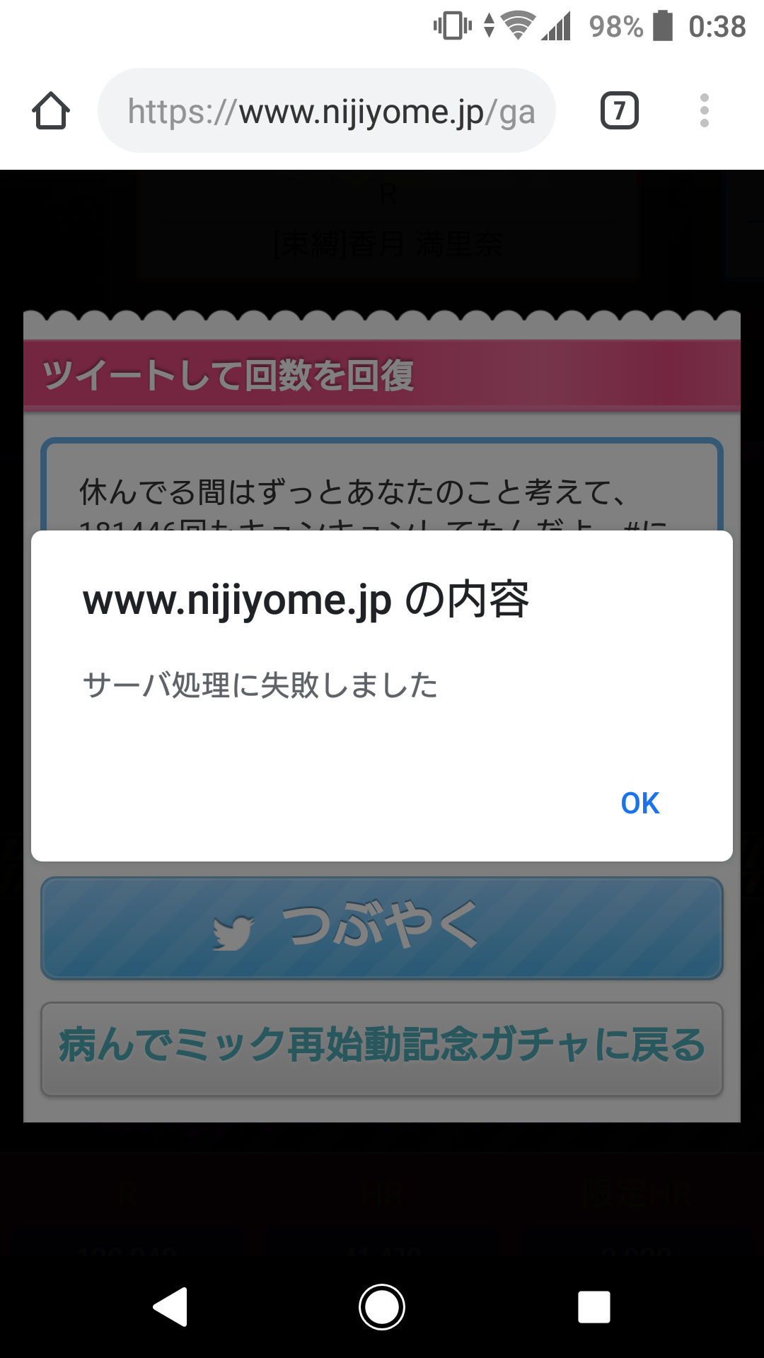 処理失敗は、あれかも、同文のついーとが弾かれるって奴、前にほかのゲームでもあって、修正されてた。こっちも文章が単純だから、カウンターが進んでないと同じ文になっちゃうんじゃない?