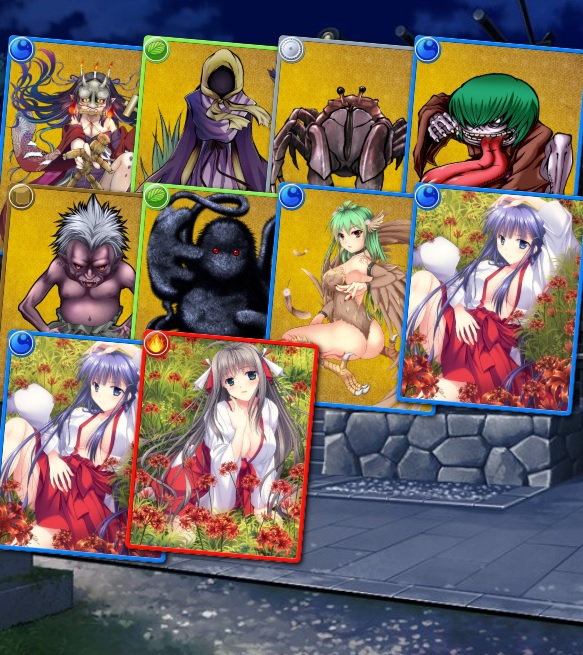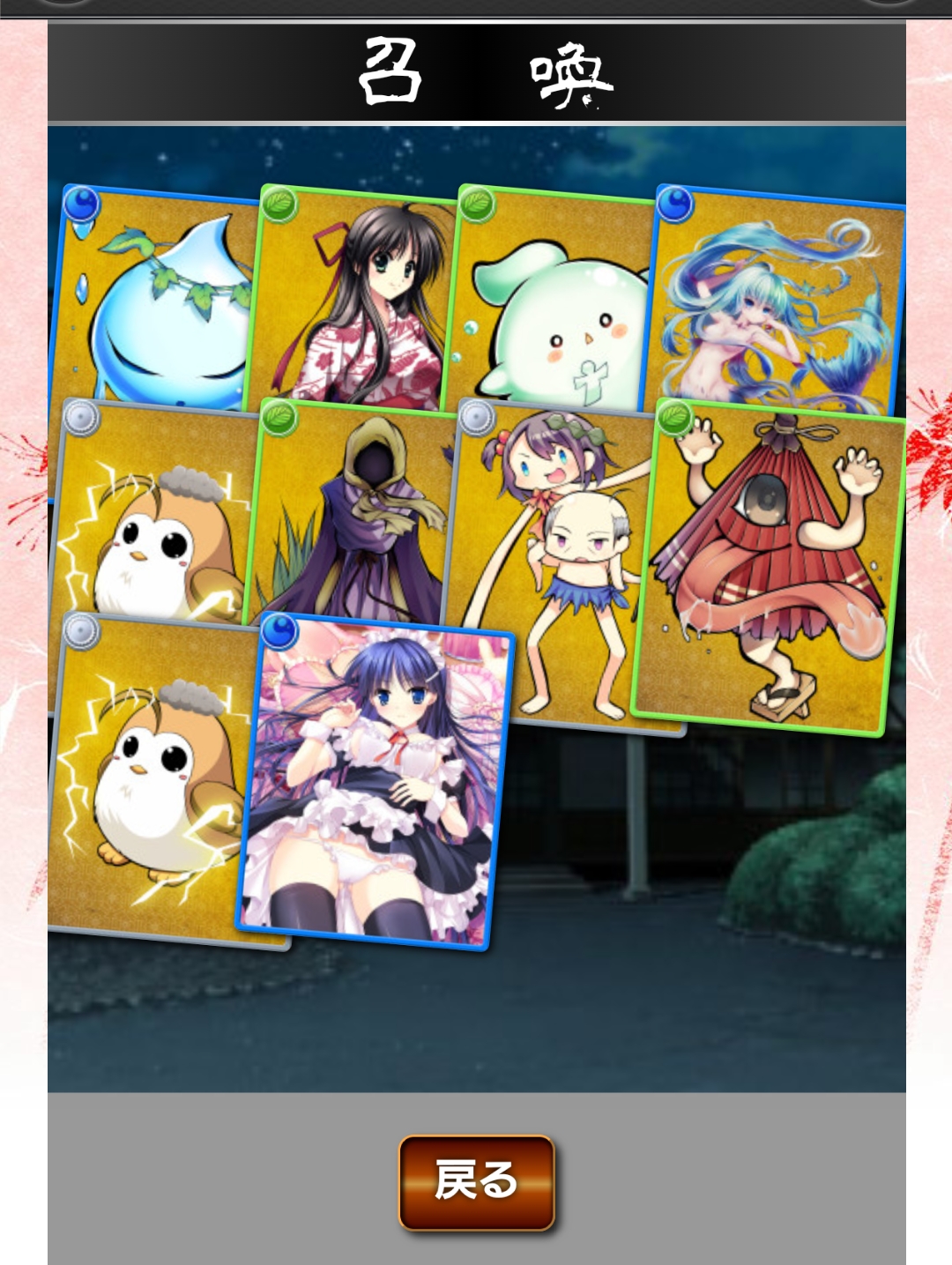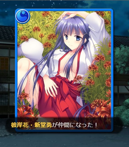 87回(召喚書27、巫女召喚16、特別召喚甲44)まわして樹と地のでぼ雀×1、黎明記・小春×1、彼岸花・勇×5。召喚出現率アップ!でやったのに本命の彼岸花・護が一枚も出ないとは…ガフッ(吐血)