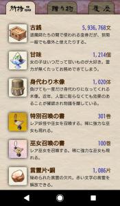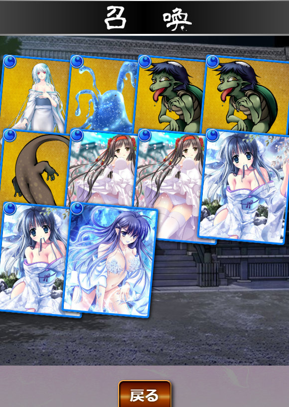 今回の召喚はひどかったなあ・・特別召喚(甲)×11を10連、(乙)×10を7連、巫女召喚×10を1連やって本命のチャイナ護が1枚しか出なかった(´;ω;`) 仕方ないので甲10連で得た勾玉使うか・・・