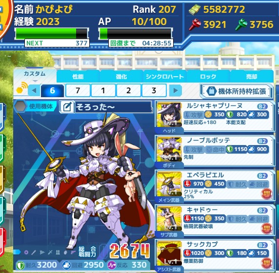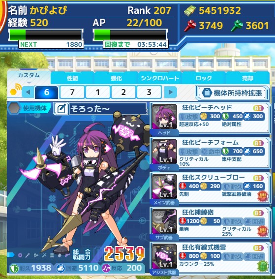 boxで運よくマッドハッター落ちたので、命中、回避に全振りしなおして頑張ってみました。が、最後の残り1体で回復薬切れて、残りAPで出るかどうかの運に……