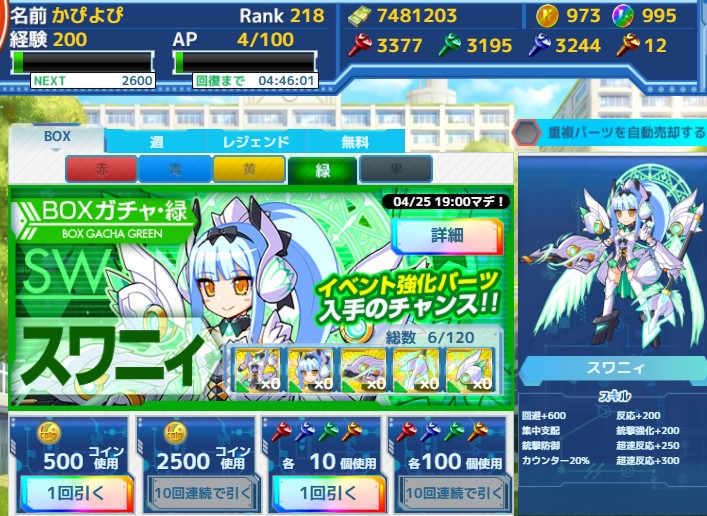 やっとスワニィ青コンプ。140連かかったよ。イベント中稼いだ金ネジ800個がふっとんだorz