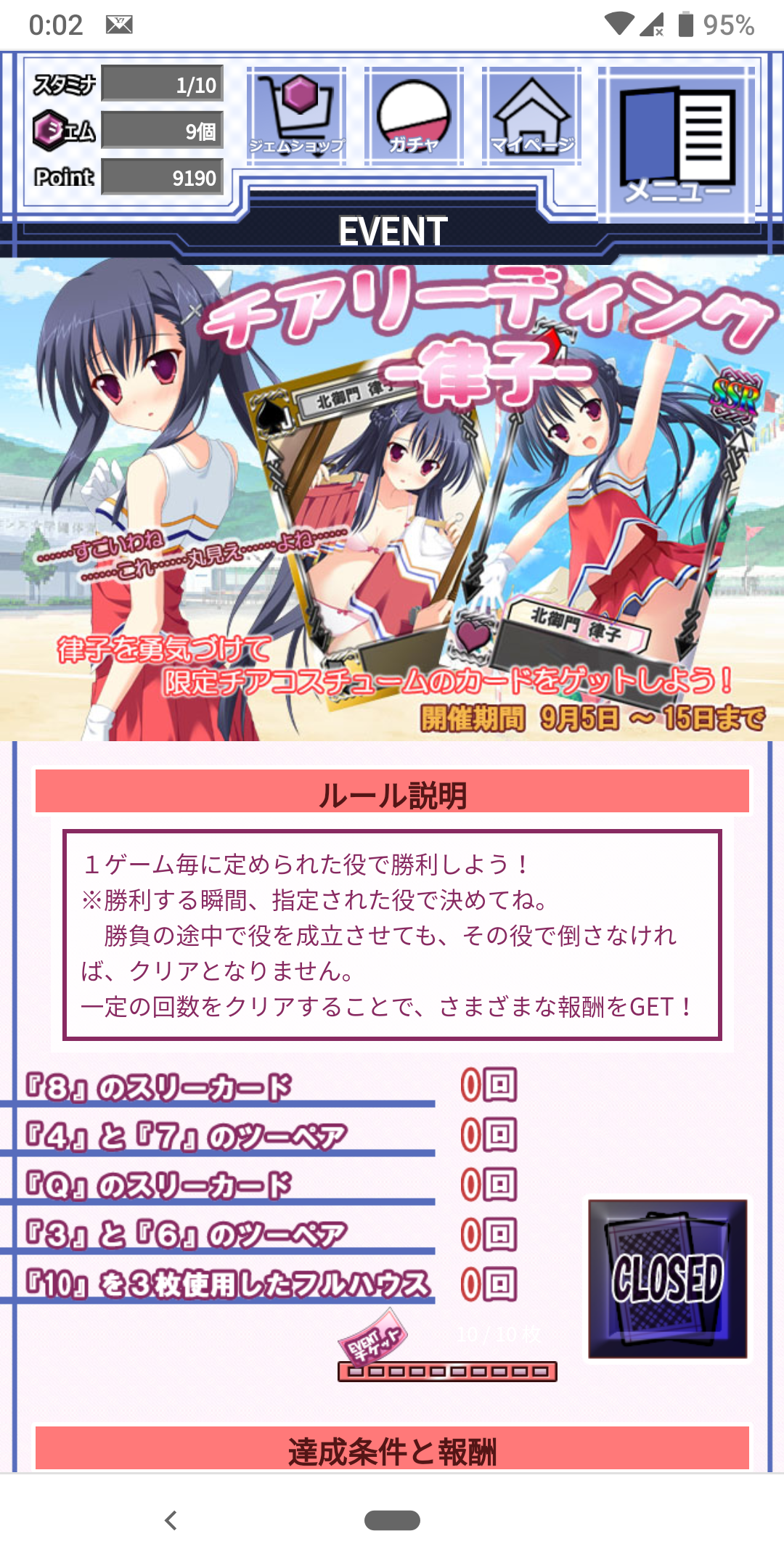 345のストレート課題で2345Aでのストレートはカウントされる。逆に10Jのストレート課題で10JQKAのストレートはロイヤルストレート扱いになるのでカウントされない点に注意。もちろんストレートフラッシュもダメ。あがる時には左上の役を確認しよう。