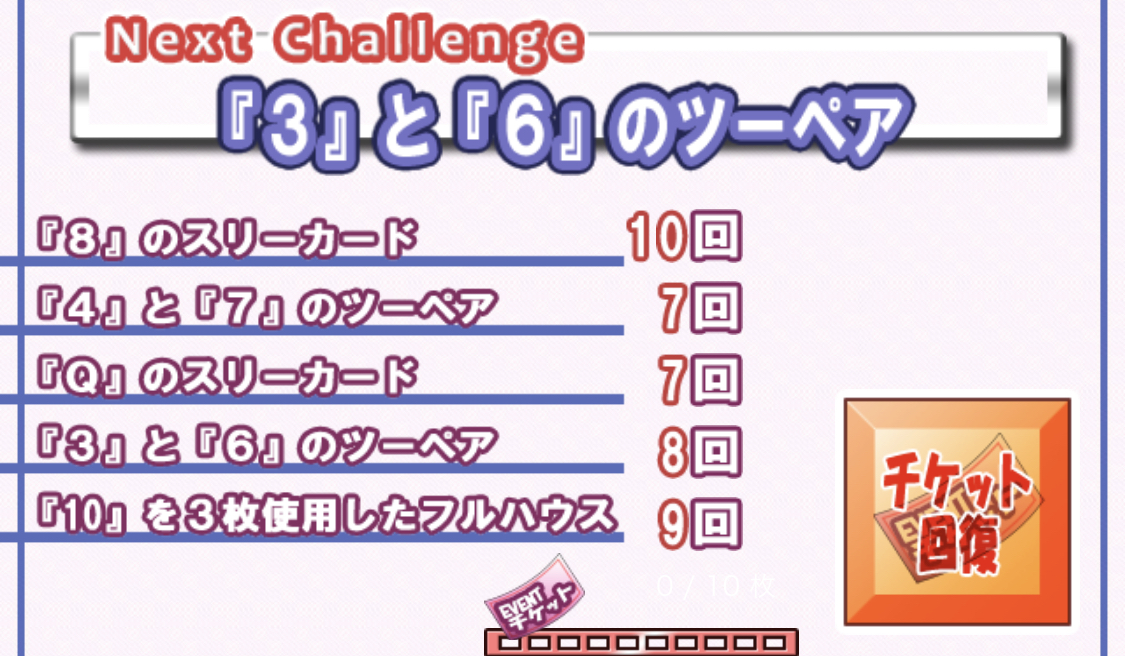 今回のイベ、10が3枚のフルハウスは3回成功したのに、ツーペアのほうは未だ1回も成功していません。