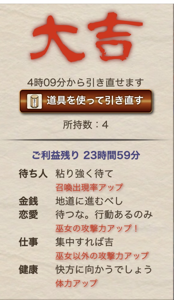 巫女舞・護狙いで、おみくじを待ち人:「召喚確率アップ!」付の大吉にして、