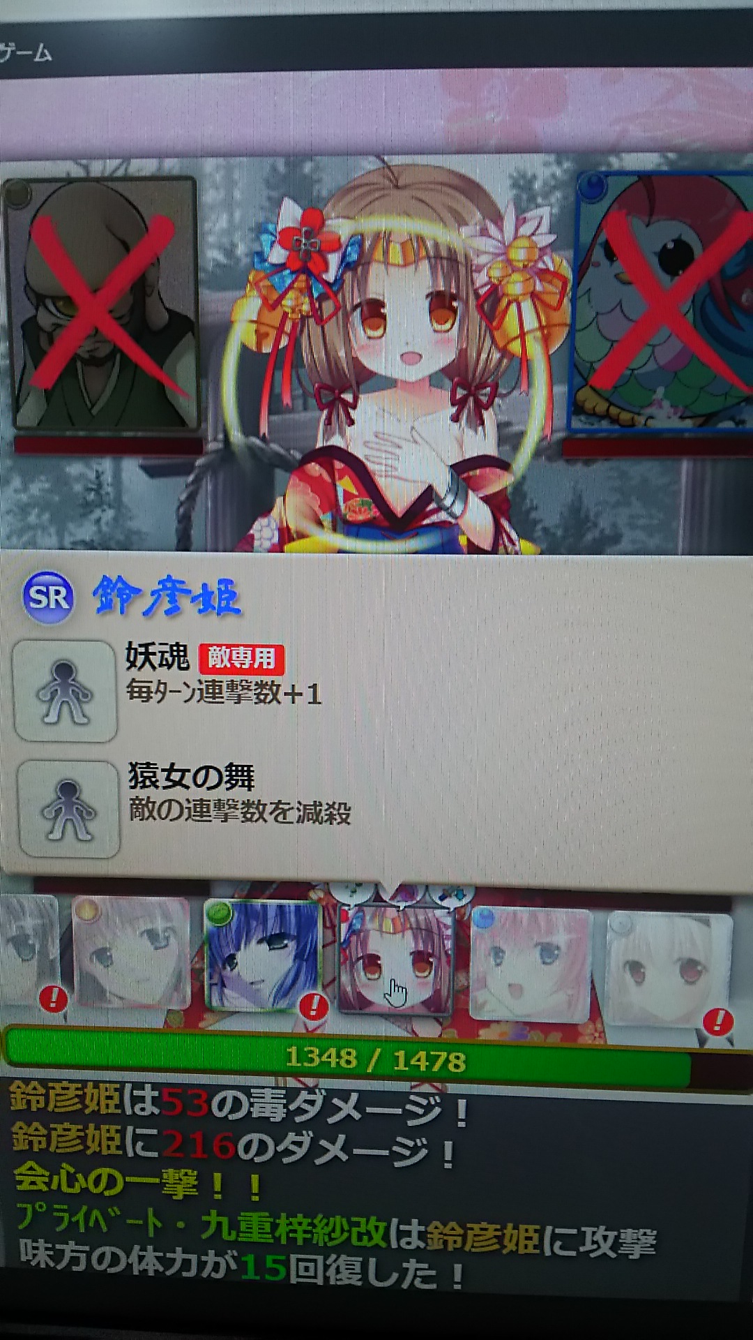 ターンごとに朝香や狂歌がコチラを攻撃した後に朝香が妖怪を、狂歌たち妖怪が朝香にも攻撃を加えるという